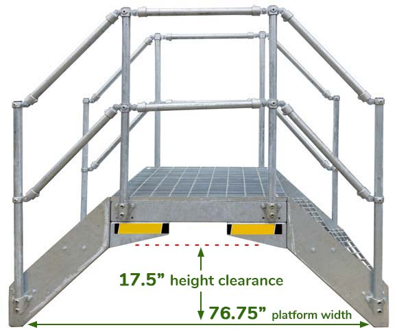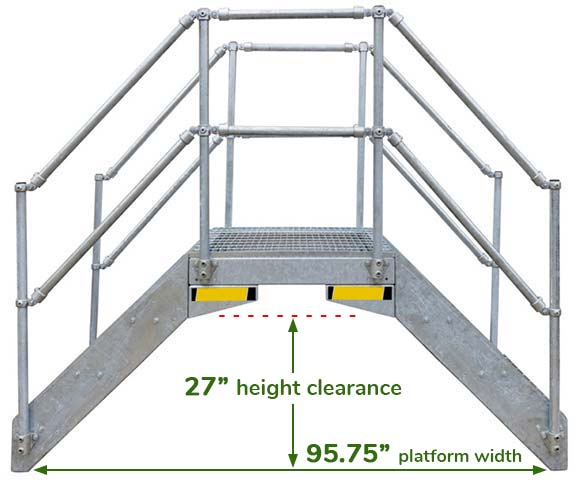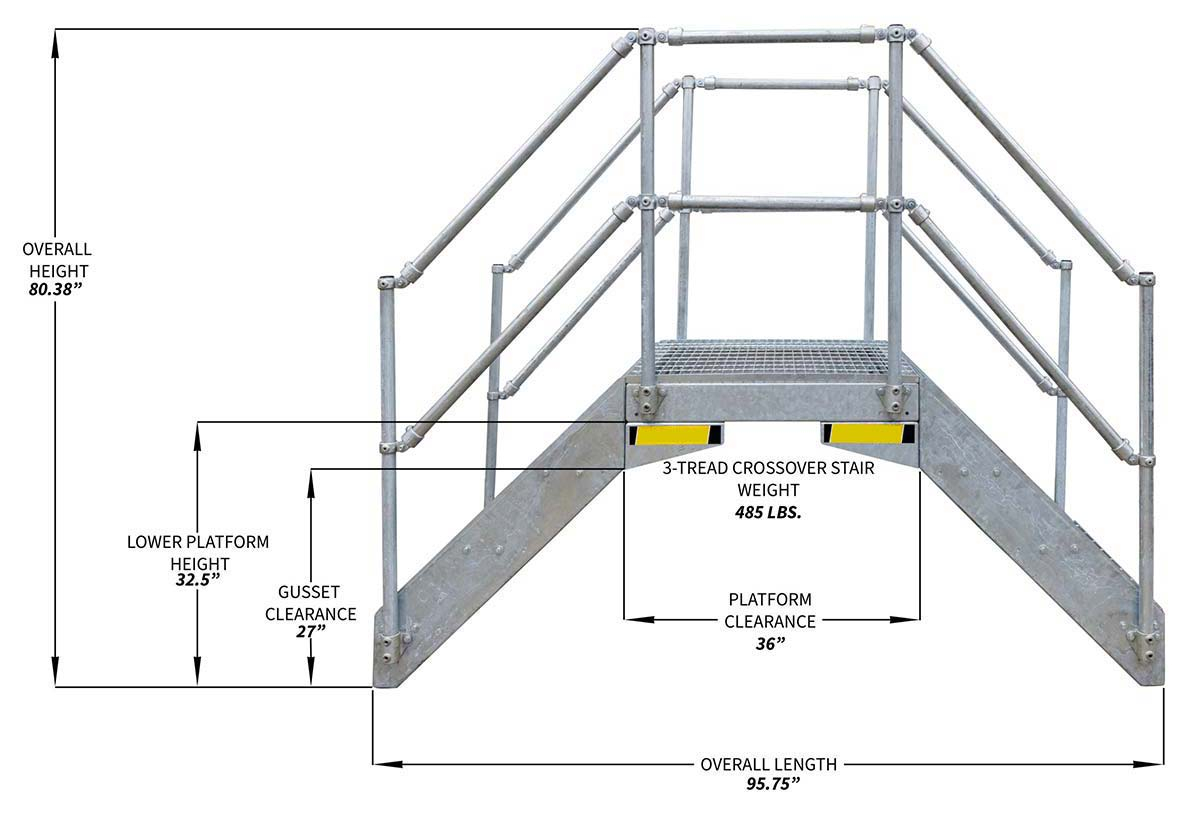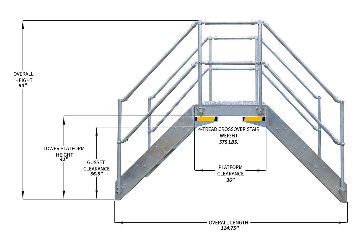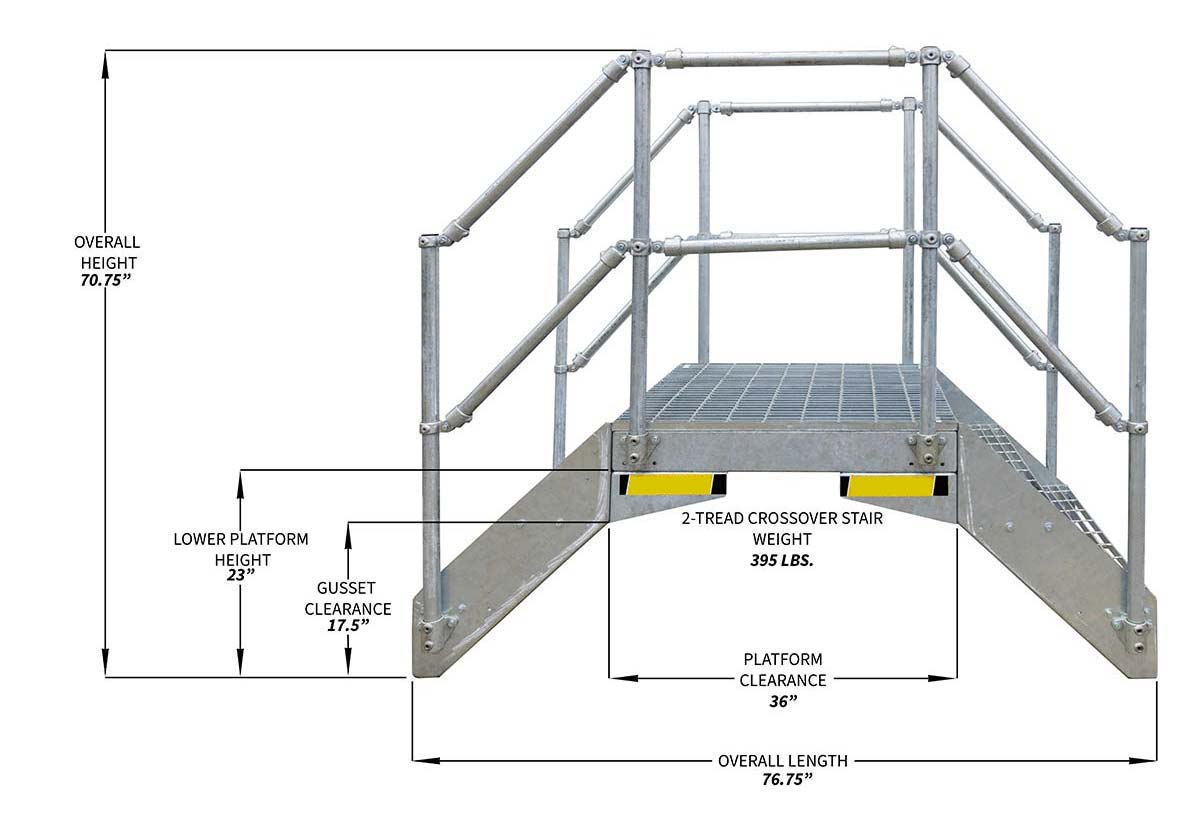 The Crossover Stair Bridge allows for safe access over pipes, expansion joints and equipment or up to elevated areas. The system uses modular, bolt-together components to construct double-sided crossover stairs. Metal stairs, platforms, heavy-duty handrails, and support towers can be combined in any number of ways to fill your unique needs.