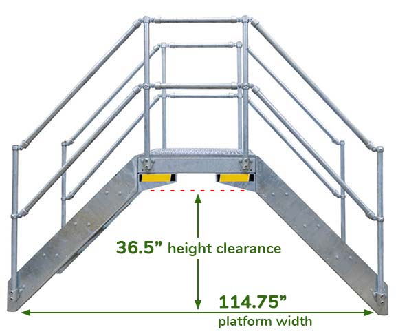 This heavy-duty bolt-together design can be quickly assembled on-site and requires no fabrication or onsite welding. The components can be brought up through a hatch, so no hoisting is required. The 36โ wide stairs can range from a single step up to seven steps before a connection is required to a work platform. Up to three 36โ X 36โ work platforms can be attached together without the need for a support tower creating a 9โ long span over large or wide obstacles. The continuous handrails meet all OSHA requirements and provides increased safety.