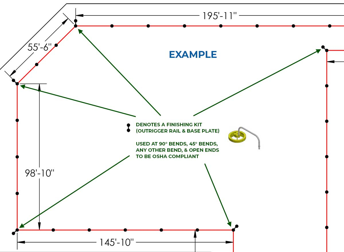 Refer to above layout to understand how Finishing Kits are used with the Warning Line system.