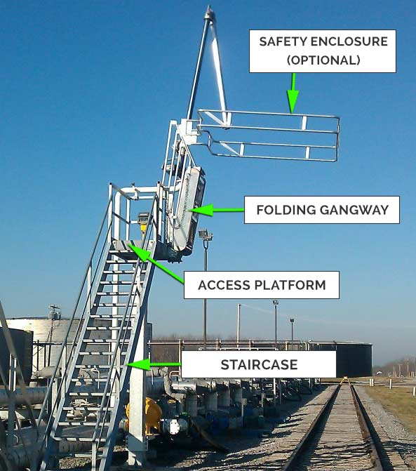 Our one hatch access systems and platform and gangway systems consist of single pedestal platform, gangway and staircase for access and optional fall prevention cage for your fall protection needs on top of single-dome tank / bulk trucks, tank cars and hopper cars.