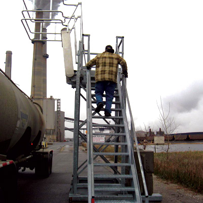 Our one hatch access systems consist of single pedestal platform, gangway and staircase for access and optional fall prevention cage for your fall protection needs on top of single-dome tank / bulk trucks, tank cars and hopper cars.