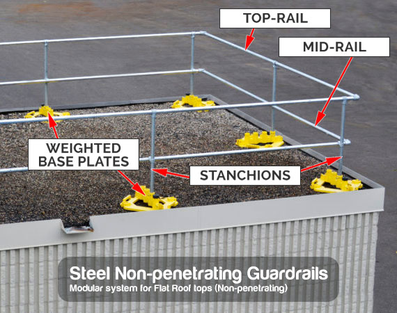 When building aesthetics are as important as addressing fall protection needs, the Steel Modular Guardrail System offers many enhanced solutions. The system railings offer clean sight lines, upscale styling, non-penetrating design. Common applications are flat roof fall protection along the leading edge of roof perimeters, ladder access points, roof hatches, skylight guarding and more. Our guardrail systems are also used on loading docks, shipping pit protection, warehouse traffic lanes, crowd control, pier and rail yard protection and much more.