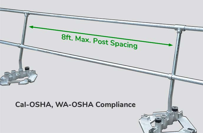 OSHA COMPLIANCE: This guardrail system requires to meet a force of at least 200 pounds (890 N), and has a maximum spacing between uprights/stanchions of 10 feet on center (120 inches or 3.04 meters). OSHA 1910.29(b) and 1926.502(b). CAL/OSHA COMPLIANCE: This guardrail system if installed in the state of California or Washington, requires a maximum spacing between uprights/stanchions of 8 feet on center (96 inches or 2.44 meters). Cal-OSHA Title 9, 1620 and 3209. WA-OSHA WAC 296-24-75011.