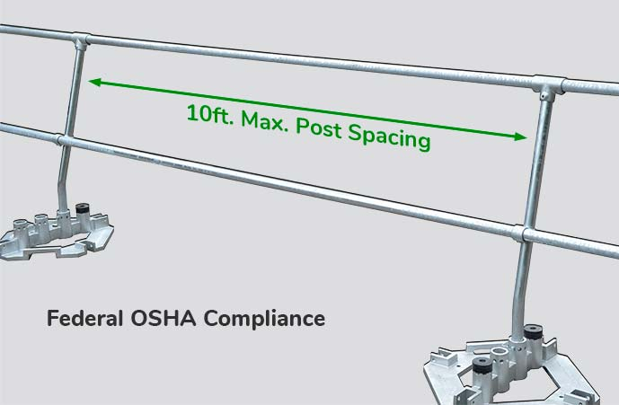 Federal OSHA COMPLIANCE: This guardrail system requires to meet a force of at least 200 pounds (890 N), and has a maximum spacing between uprights/stanchions of 10 feet on center (120 inches or 3.04 meters). OSHA 1910.29(b) and 1926.502(b). Cal-OSHA / WA-OSHA COMPLIANCE: This guardrail system if installed in the state of California or Washington, requires a maximum spacing between uprights/stanchions of 8 feet on center (96 inches or 2.44 meters). Cal-OSHA Title 9, 1620 and 3209. WA-OSHA WAC 296-24-75011.