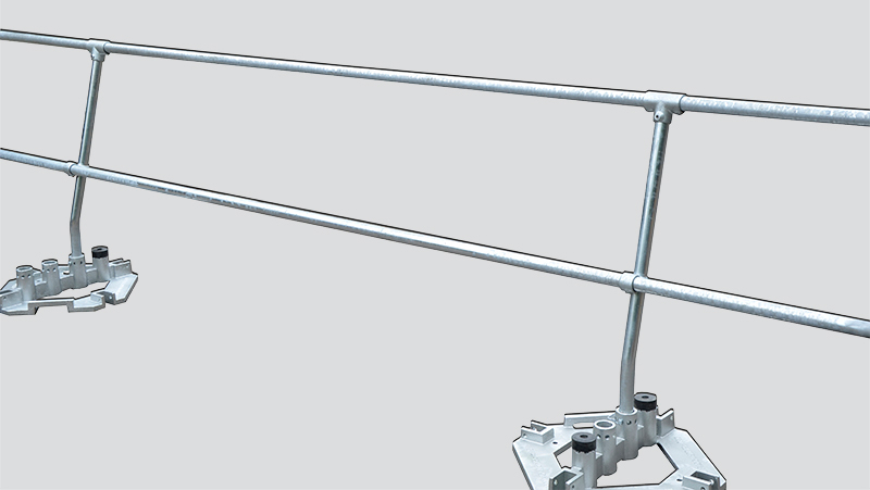 Kit Components: Non-penetrating Base Plates with EPDM/Rubber Pads (Galvanized finish), Straight or Curved Intermediate Posts with hardware, Straight or Curved End Posts with hardware, Handrails, Kneerails, Rail Joints, End Caps, Handrail Braces, 5ft. Return Kits, Corner Kits, Safety Gate (optional), Toeboards (optional)