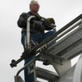 User is able to clip onto fall protection system while climbing the access ladder.