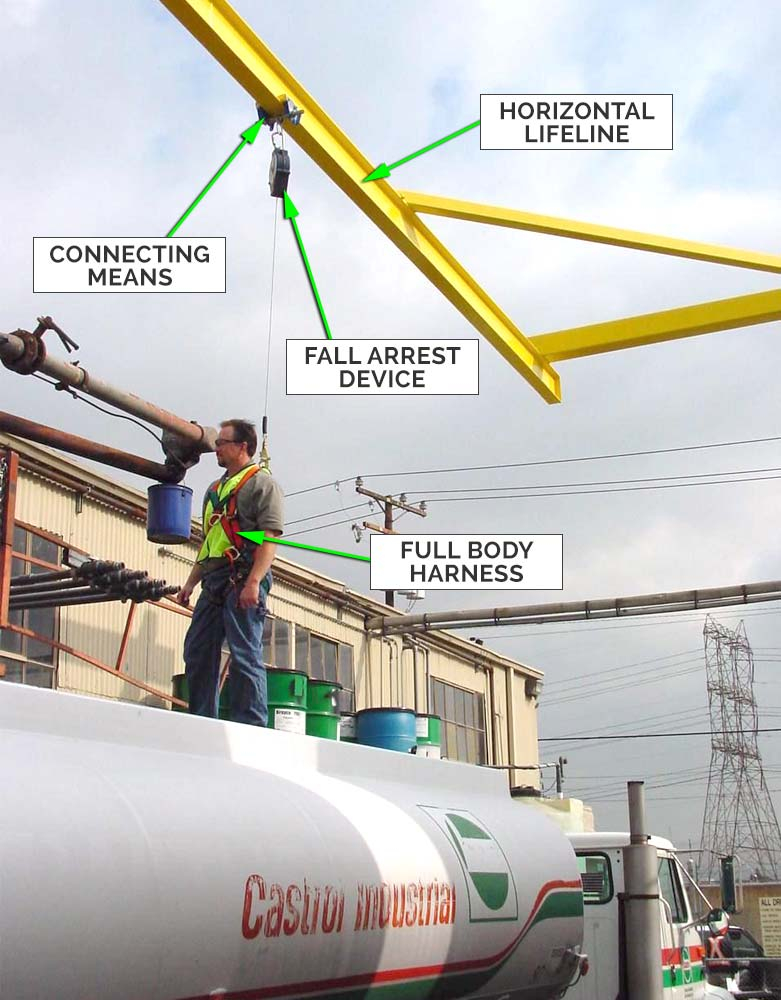 Outdoor Freestanding Systems provide OSHA compliant fall protection coverage for tanker trucks. Custom engineered fall arrest anchors along with horizontal lifelines provide safety coverage for your truck loading needs. Our OSHA and MSHA compliant outdoor freestanding system are designed to provide safety for tanker, flatbed and trailer trucks.